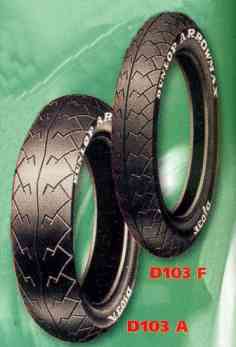 | D103F AV D103 A AR | ![]() | -110/70 54 -diagonal -version S ( 180 km/h ) : 72 € -version H ( 210 km/h ) : 77 € - Trés bonne adhérence sur le sec et un peu en retrait sur le mouillé. Gomme un peu tendre. Longévité correcte. Profil en V. |
