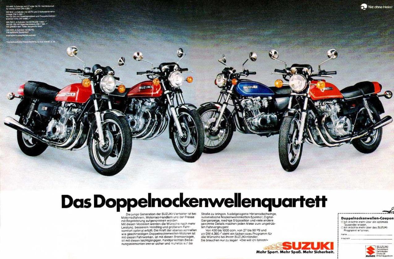 C'est en 1976 avec la GS400 qu'apparait la motorisation dont est issu la GS500. La GS400 possède un des premiers moteurs 4T Suzuki depuis la Colleda COX dans les années 50. Le bicylindre vertical de 398cm3 possédait déjà un double arbre à cames en tête, un tendeur de chaine automatique, des manetons de villebrequin calés à 180° ainsi qu'un arbre d'équilibrage pour atténuer les vibrations de l'équipage mobile. Le démarrage se fait électriquement ou par kick. Le tableau de bord est agrémenté d'un indicateur de rapport engagé.